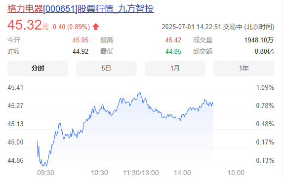 7月1日,截至记者发稿,格力电器的股价上涨0.89%。